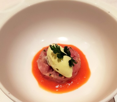 Le Champagne Krug Cuvée d’Ambonnay Blanc de Noirs 1998 est l’apport de Tomo. C’est une très agréable surprise car ce champagne qui a maintenant 20 ans jouit d’une belle maturité. Cohérent, noble, il va accompagner certains plats avec bonheur. Je l’aime beaucoup alors que jusqu’à présent je n’avais jamais été enthousiasmé par ce champagne plus cher que d’autres cuvées de Krug qui sont plus complexes.