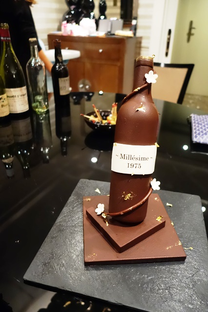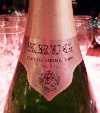 Tomo, mon compagnon d’aventures folles autour du vin fête ses quarante ans. Il a loué pour lui, son épouse, sa toute petite fille et des accompagnants la suite la plus belle de l’hôtel Shangri La dont on me dit qu’elle fut la demeure d’un neveu de Napoléon grand amateur d’herboristerie. La suite dispose d’une immense terrasse d’où la vue est à couper le souffle. On peut voir la Seine en amont et en aval avec une succession de ponts historiques. La Tour Eiffel s’impose dans le paysage. Nous la verrons changer de couleur avant le dîner et d’illuminations après le dîner. Cette vue est un spectacle impressionnant. L’apéritif se prend sur cette terrasse avec un Champagne Krug Grande Cuvée en jéroboam. Alors que les jeunes Grande Cuvée sont souvent tout fous, verts, sauvages, l’effet du format de la bouteille est impressionnant. Le champagne est très facile à boire, donne en permanence envie d’y revenir et frappe par sa sérénité. C’est un régal de champagne noble, vif et très rassurant.