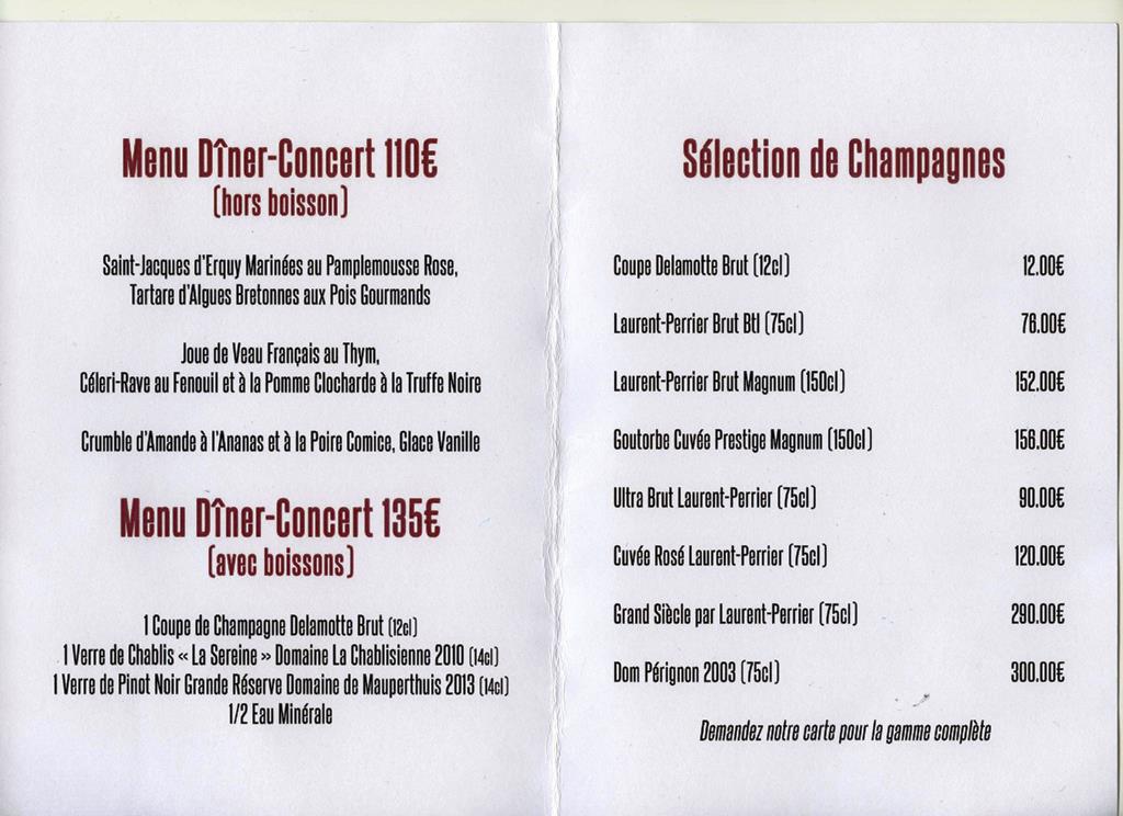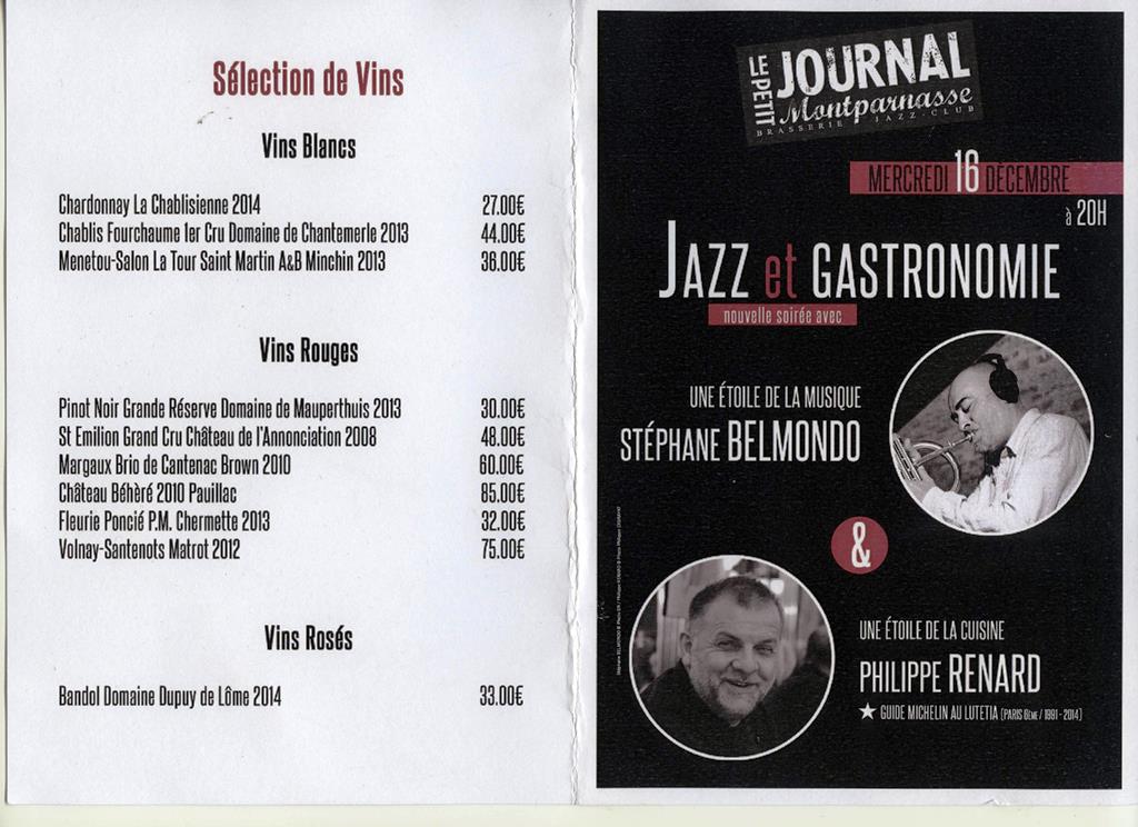 Ma femme et moi avions adoré les concerts au Petit Journal de Montparnasse. Ce soir il s’agira d’une soirée Jazz et Gastronomie, avec le chef Philippe Renard, qui a eu une étoile au Lutetia et un trio dirigé par Stéphane Belmondo. André Robert m’avait dit : « tu viens avec du vin si tu veux » et le journaliste Jacques Pauper, animateur du site « couleursjazz.fr » avait souhaité que nos tables soient proches pour profiter ensemble de la soirée, avec son épouse et la mienne.