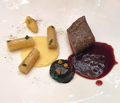 Les deux blancs sont associés à la langoustine. Le Château Haut Brion blanc 1966 est d’une couleur claire, frais et riche. Il offre une densité forte et une belle longueur. C’est un grand vin blanc noble.