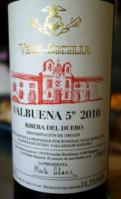 Le Valbuena 5° Vega Sicilia 2010 titre 14,5°. Riche, extrêmement généreux et moderne, il est d’une très belle fraîcheur avec de belles notes mentholées. Ce vin moderne et lourd est très plaisant. Même s’il n’atteint pas les complexités du Vega Sicilia Unico, ce vin est très agréable à boire. Il est fini sur des fromages avec lesquels il voisine bien.