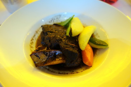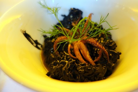 Le menu préparé par le restaurant Lavinia est : risotto avec chipirons à l’encre de seiche / daube de chevreuil au vin de la Ribeira del Duero / Manchego et pâtes de fruits / Poire Williams pochée au vin rouge.
