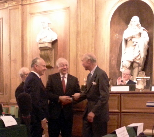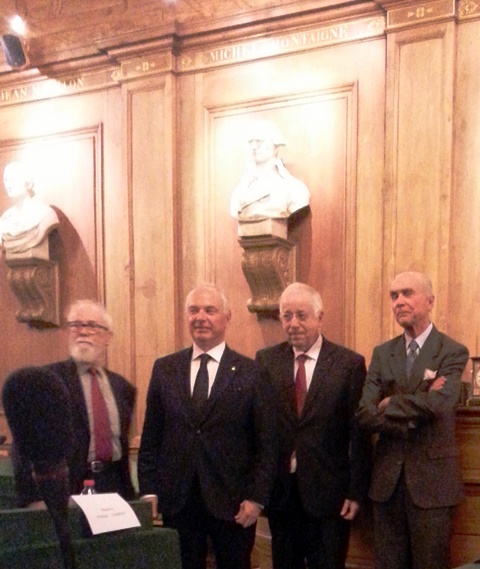Les discours sont prononcés par Gabriel de Broglie, chancelier de l’Institut de France, qui bien évidemment crée le lien entre le Quai Conti et la Romanée Conti, Jean Pierre Corbeau Président de l’Institut Européen d’Histoire et des Cultures de l’Alimentation IEHCA, Jean-Robert Pitte, Président de la Fondation européenne pour le patrimoine alimentaire et Philippe Gombert, président international de Relais & Châteaux qui est sponsor de la fondation. La culture des intervenants, leur humour et leur intelligence ont permis qu’à aucun moment leurs discours n’entraînent de lassitude, au contraire. Le poids des compliments assenés à Aubert de Villaine sur son œuvre à la tête de son vignoble et pour son rôle primordial pour le classement des Climats de Bourgogne au patrimoine immémorial mondial de l’Unesco aurait pu le faire vaciller, car il s’y ajoute la charge émotionnelle de cette salle prestigieuse.
