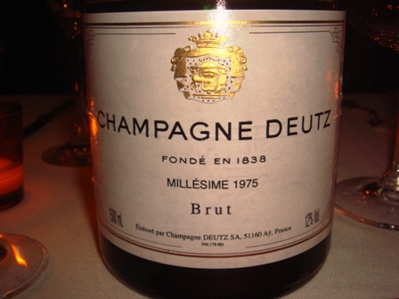 Le menu a été exceptionnellement bien traité par Hubert Keller comme l’indiquaient d’emblée les petits canapés d’un raffinement particulier. Le Champagne Brut Classic Deutz en magnum 1975 joue parfaitement son rôle d’ouverture. Doté d’une très belle maturité, il manque sans doute un peu de puissance et de coffre, mais il est très agréable et laisse une belle trace en bouche. Flexible, il s’adapte à tous les caprices des amuse-bouche.