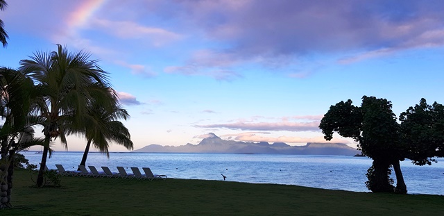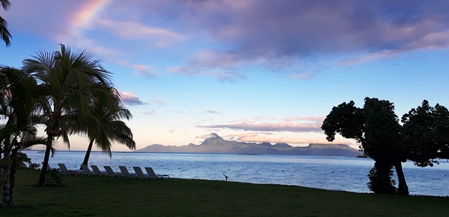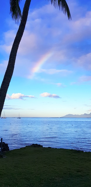 Tour du Monde – dernier soir à Tahitilundi, 20 novembre 2017 C’est la fête tous les soirs ! le lendemain matin, à 5h50 avant de prendre l’avion, le ciel nous gratifie d’un bel arc-en-ciel. beau présage au revoir Tahiti, vrai paradis