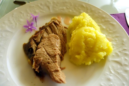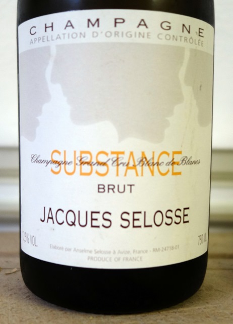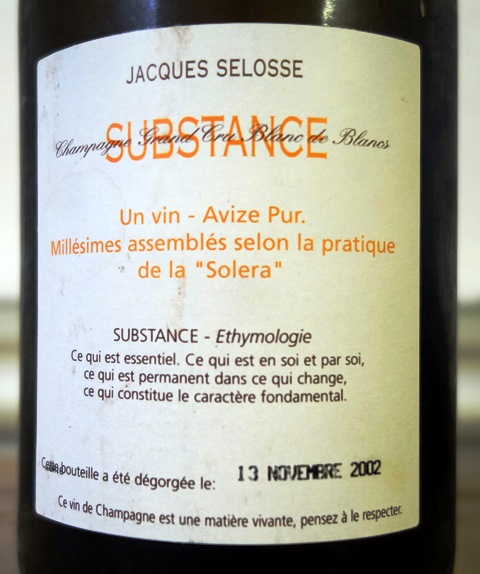 A 20h30 nous sommes au complet, neuf, dont sept buveurs. Le Champagne Substance Jacques Selosse dégorgé en novembre 2002 est une inconnue, car j’ai eu parfois des déconvenues avec des Substance bus longtemps après le dégorgement. Le pschitt est très beau. Ce que m’inspire le premier contact et qui fait rire mes amis, c’est : « il est très Substance, très Selosse, d’une belle évolution ». Cela fait rire mais c’est vrai car ce champagne a toutes les caractéristiques du Substance, très vineux, un peu fumé, avec des accents de tisane ou de thé. Il a bien géré son évolution depuis son dégorgement ce qui est une bonne nouvelle. Il est mis en valeur par des tranches de Pata Negra mais surtout par un sublime fromage de tête qui lui va à ravir.