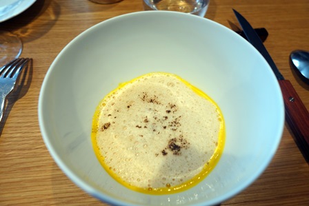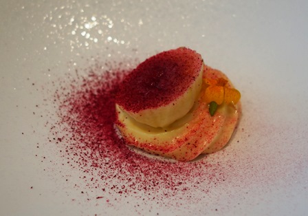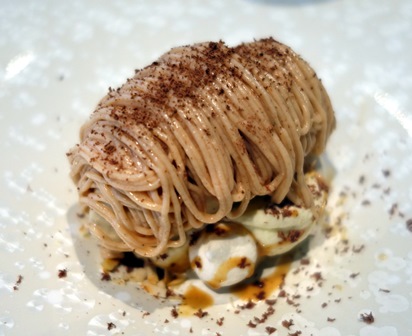 Le menu n’est pas imprimé mais chaque plat est très bien expliqué par Benoît : Beignet de haricots violets et anchois de Guétary / Velouté de potiron et potimarron, cappuccino de moka infusé au foin, dés de foie gras / Bonite de Saint-Jean-de-Luz, betterave et trilogie de radis d’Annie Bertin, poutargue / Saint Pierre de l’île d’Yeu, roquette shungiku et épinards, sauce émulsion de livèche et huile de livèche, cèpes des Vosges / Gigot d’agneau de Lozère, chou pointu, girolles et pleurotes jaunes, jus de viande / Crème au yuzu, figue verte et granité de fromage blanc au yuzu / Crème de châtaigne, glace au thé noir grillé, mascarpone et meringue, copeaux de noisettes du Piémont / Mignardises : Cannelé et truffe au chocolat parfumé au thé Assam.