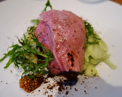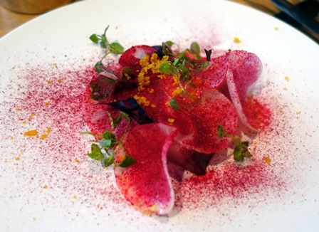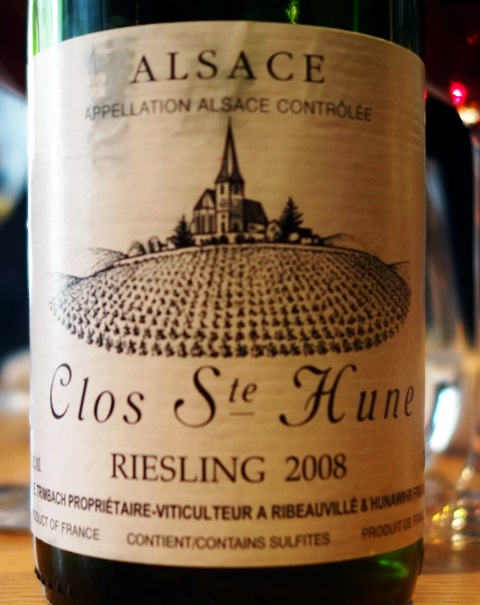 J’ai commandé de la carte des vins un Riesling Clos Sainte Hune Trimbach 2008. Ce vin est la perfection cristalline du riesling. C’est un vin « évident ». Il joue tellement juste qu’il paraît intemporel. Il est parfait sur la bonite à laquelle la betterave n’apporte pas de réel avantage contrairement aux radis. Mais la mode « terre et mer » est tenace. Ce vin combine une acidité très contrôlée avec un gouleyant gourmand.