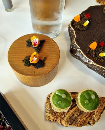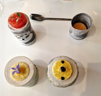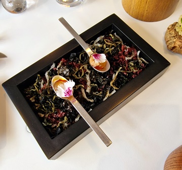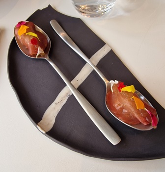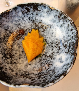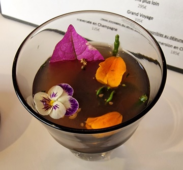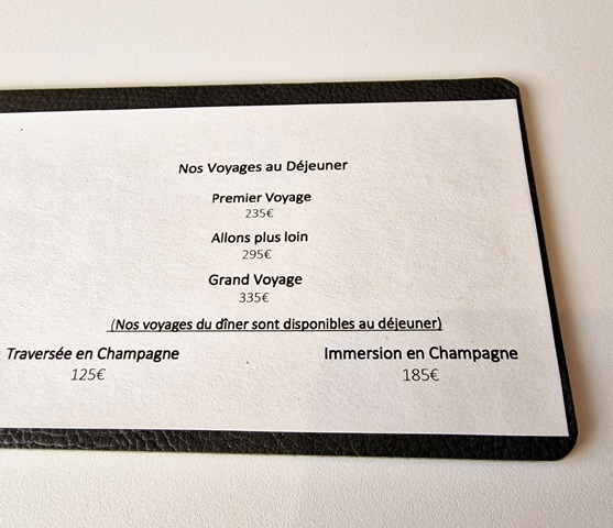Nous sommes reçus comme des amis par l’ensemble du personnel, dont Jean-Philippe, Kevin le sommelier et Margot. Nous choisissons le « Premier Voyage » car les deux dernières fois, les voyages plus généreux en plats étaient en fait trop généreux.