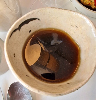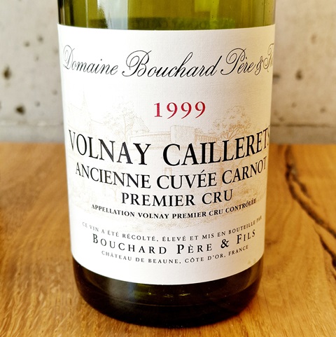 J’avais tellement aimé le Volnay les Caillerets, ancienne Cuvée Carnot, Bouchard Père & Fils 1999 dès le premier repas de juin que je l’avais commandé à nouveau au déjeuner suivant et j’avais une fois de plus considéré que ce Premier Cru joue dans la cour des Grands Crus. J’ai demandé alors à Kevin s’il en restait en cave et il en restait une que j’ai réservée pour ce repas. Comme les fois précédentes, j’ai demandé que le vin soit ouvert au dernier moment. Au nez, il me semble que ce n’est pas ce que j’attendais, mais Kevin a dû vérifier. Assez rapidement il m’apparaît que ce vin n’est qu’une pâle copie de ce que nous avions bu les deux fois précédentes. Kevin a pu confirmer ce que j’ai ressenti.