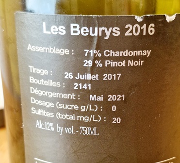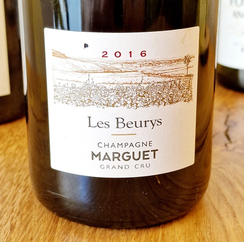 Pour la suite du repas, j’aimerais un champagne qui ait du pinot noir. Comme le Champagne Marguet Verzenay 2016 100% pinot noir m’avait plu, Kevin me suggère de prendre le Champagne Les Beurys Marguet Grand Cru 2016 qui a 71% de chardonnay et 29% de pinot noir, dégorgé en mai 2021 comme le Verzenay précédent.