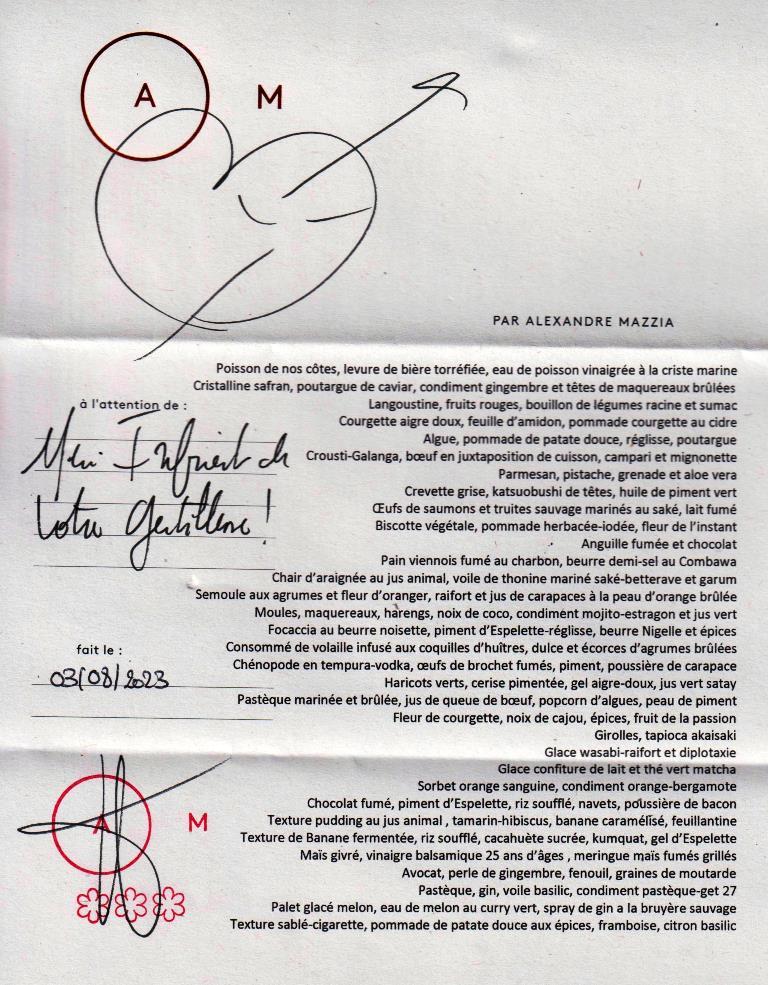 Pour la troisième fois cet été nous allons déjeuner au restaurant Alexandre Mazzia à Marseille. Nous avons invité notre fille aînée et ses deux filles. L’une d’entre elles suivait depuis longtemps Alexandre Mazzia, avec une admiration et une vénération certaines, mais elle n’était jamais venue en ce lieu.