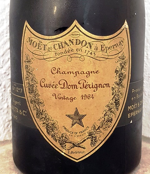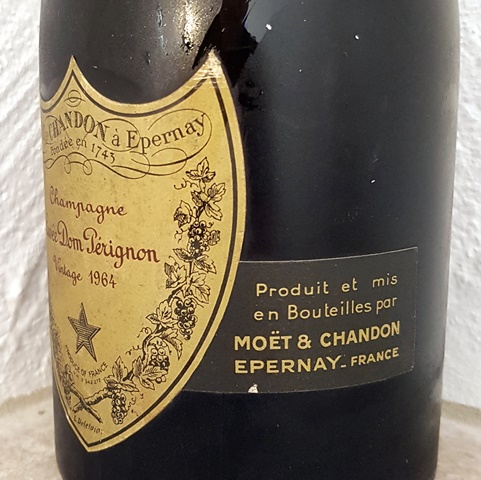 Nous faisons place nette sur les tables d’apéritif pour passer à la seconde partie où j’associe deux champagnes, le Champagne Dom Pérignon 1964 et le Champagne Krug Grande Cuvée qui doit avoir plus de trente ans puisqu’un propriétaire précédent a inscrit « acheté en 1992 » inscription que j’ai déjà lue sur une précédente bouteille bue avec mon fils.