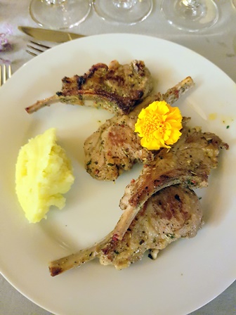 Nous passons à table et le menu est : camerones juste saisis, côtelettes d’agneau aux herbes de Provence et purée de pomme de terre, purée de céleri et dés de céleri, fromages divers et mangues saisies « tourne et retourne » avec de petites madeleines au miel de châtaignier.