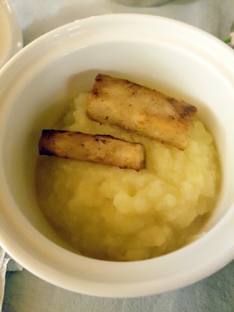 Le Champagne Selosse Grand Cru Initial Blanc de Blancs Brut dégorgé le 21 septembre 2011, un jour d’équinoxe, est servi en même temps que le Champagne Selosse Grand Cru Extra Brut millésimé 2005 dégorgé le 25 novembre 2015. Les deux champagnes ont des couleurs très semblables, d’un bel or clair. Selon les saveurs associées et en fonction du réchauffement progressif des champagnes dans les verres, les préférences vont varier, tantôt pour l’un tantôt pour l’autre. L’Initial est fait de vins de trois années successives contrairement au millésimé. Je le trouve plus ample et au finale plus rebondissant que le millésimé, plus fin, plus délicat. Bien malin celui qui départagerait ces deux champagnes excellents, très différents mais ayant un ADN commun de cette grande maison de champagne. Les petites sardines sont idéales sur ces deux champagnes très vifs.