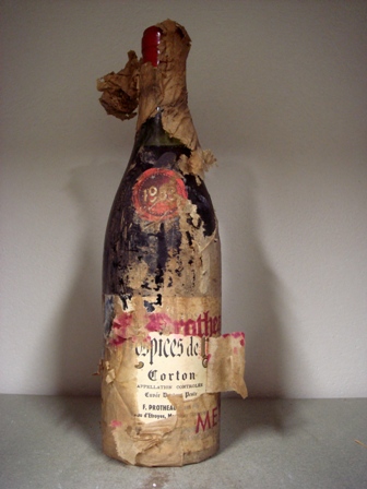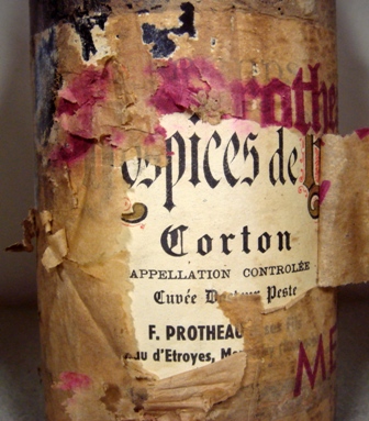 Corton Cuvée du docteur Peste Hospices de Beaune 1953 (la bouteille n’est pas très présentable, mais ce qui compte, c’est ce qui est à l’intérieur. J’ai un peu nettoyé la capsule du millésime pour constater que c’est 1953 et non 1933 comme je le croyais)