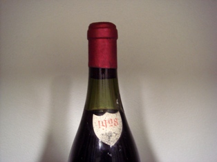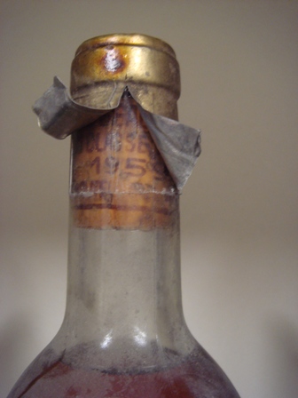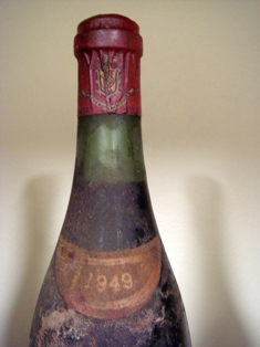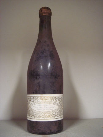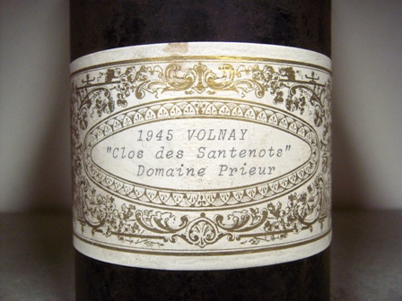 Volnay Clos des Santenots Domaine Prieur 1945 (la bouteille a été cirée par la maison Calvet & Co, et l’étiquette à l’ancienne est tapée à la machine)