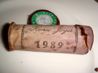 Le bouchon du Cros Parantoux Henri Jayer 1989 et celui de l’Angélus 1961. Pour l’Angélus, il y a marqué "Pomerol" sur ce bouchon du 1961, sans indication du nom du vin.