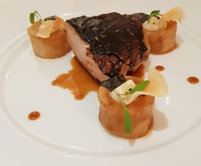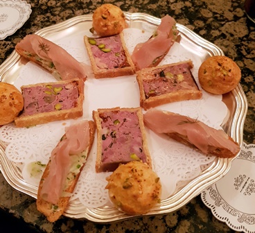 Le menu qui a été créé par Alain Pégouret pour les vins de ce soir est : Amuse-bouche : rôtie au thon, gougère, pâté en croûte / Saint-Jacques marinées, radis en aigre-doux et salade potagère aux noisettes, gelée de « granny smith » / Turbot nacré à l’huile d’olive, bardes et légumes verts dans une fleurette iodée / Noix de ris de veau grillotée à la plancha et relevée à l’ail noir, purée de topinambour et céleri / Carré d’agneau, pommes soufflées « Laurent », jus / Chaource, Camembert / Pomme fondante au caramel façon « Tatin », arlette croustillante, crème d’Isigny / Palmiers.