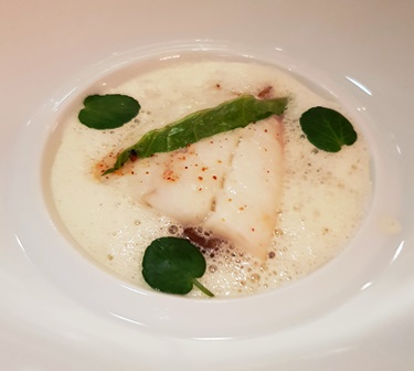 A ses côtés le Musigny blanc Domaine Comte Georges de Vogüé 1986 a un nez très discret qui pose même des questions à Bipin Desai qui se demande s’il n’est pas dévié. Mais en fait ce vin a besoin de s’ouvrir, ce qu’il ne fera que lentement. Longtemps une énigme il délivrera un message d’une rare subtilité que j’ai appréciée en fin de verre. Difficile à comprendre il me plait beaucoup car il est raffiné. L’accord avec le turbot se trouve surtout avec la divine sauce. Le plat est excellent.