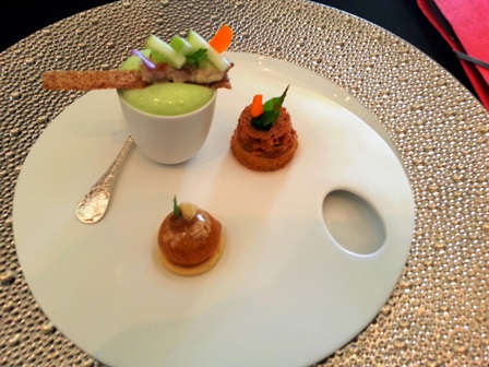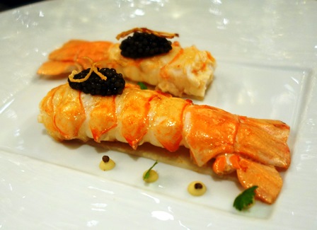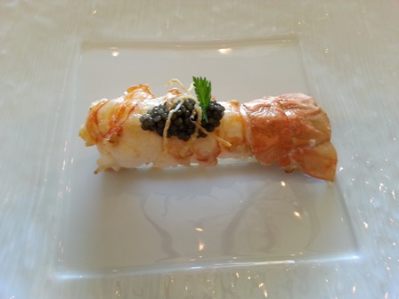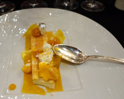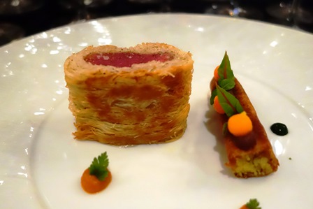 Le menu composé par le chef est : trilogie gourmande, barbe à papa et toast de Pata Negra / émietté de tourteau à l’estragon, mousseline de chou-fleur et espuma de jus de coquillage / belles langoustines rôties au beurre demi-sel et caviar de Sologne / turbot de ligne aux cèpes cuit et servi en brioche, cèpes rôtis, polenta crémeuse et brunoise fraîche / canon d’agneau de lait d’Orient, filet cuit en kadaïf et citron confit, pastilla de boulgour aux épices douces et menthe fraîche / Stilton / Transparence de pomelos rose et macaron Américano / mangue en texture surmontée d’un petit gâteau mascarpone brioché / délicatesses.