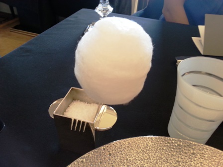 Dans le calme frais du soir nous prenons le Champagne Salon 1997 sur la terrasse de l’hôtel d’où l’on voit la mer et les belles montagnes à perte de vue. Le champagne est droit, précis, vineux, mais il est très jeune. La barbe à papa est un clin d’œil amusant aux plaisirs de l’enfance. Le toast au Pata Negra est ce qui convient le mieux au délicieux champagne à la longueur sensible.