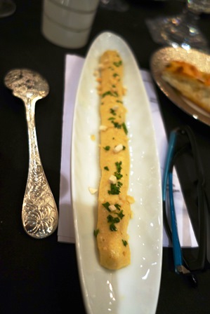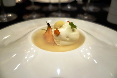 Nous passons à table et sur l’amuse-bouche Florent nous sert le Champagne Lanson Red Label 1961. Le parfum de ce champagne est irréellement envoûtant. Un convive bizut préférera le parfum au vin lui-même, ce qui n’est pas mon cas. C’est en bouche que tout se joue, le champagne délivrant des complexités inimaginables et changeant à chaque gorgée. Tout y est, fruits rouges, caramel, beurre. On pourrait à chaque gorgée penser à une saveur et on la trouverait. Je trouve ce champagne parfait et mon vote final en portera témoignage.