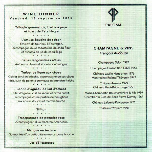 Le 191ème dîner de wine-dinners se tient au restaurant Paloma de Mougins dont le chef Nicolas Decherchi fut doté d’une étoile au guide Michelin en un temps record. J’étais venu il y a quelques mois étudier la cuisine du chef pour qu’elle corresponde aux vins anciens choisis pour le dîner. Des ajustements se sont faits par mail et par téléphone, mais par acquit de conscience, je déjeune au restaurant Paloma, le jour du 191ème dîner, pour vérifier une fois encore l’adaptation des recettes aux vins anciens. Par précaution, le déjeuner sera à l’eau. Les petits amuse-bouche me semblent un peu copieux lorsque l’on sait ce qui suivra ce soir et, tenant compte de cette remarque, le chef adaptera avec bonheur le poids des éléments de sa trilogie. La langoustine au caviar est exactement ce que je recherche avec une cuisson parfaite. Le turbot a une cohérence qui me plait et un fumé un peu insistant. Ne voulant pas exagérer lors du déjeuner, j’arrête à ce stade mais Yannick, le très compétent maître d’hôtel me convainc de prendre un soufflé à la mangue extrêmement goûteux.