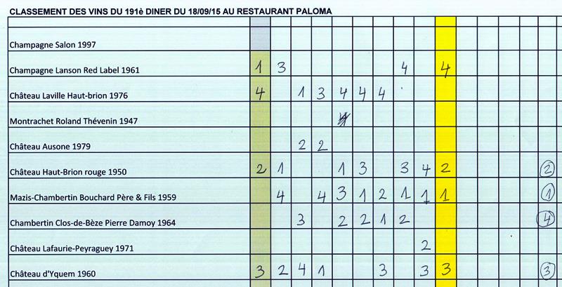 Le vote du consensus serait : 1 – Mazis-Chambertin Bouchard Père & Fils 1959 , 2 – Château Haut-Brion rouge 1950 , 3 – Château d’Yquem 1960, 4 – Chambertin Clos-de-Bèze Pierre Damoy 1964, 5 – Château Laville Haut-brion 1976.