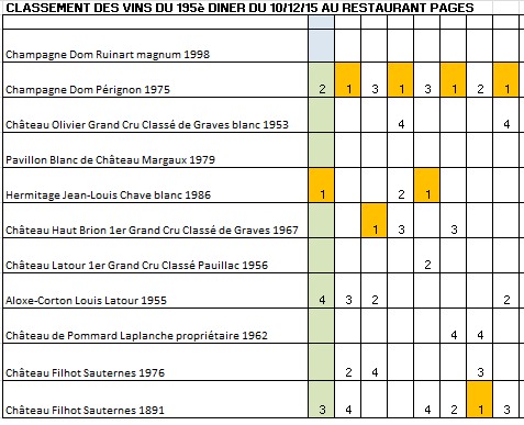 Le classement du consensus serait : 1 – Champagne Dom Pérignon 1975, 2 – Château Filhot Sauternes 1891, 3 – Hermitage Jean-Louis Chave blanc 1986, 4 – Aloxe-Corton Louis Latour 1955, 5 – Château Haut Brion 1er Grand Cru Classé de Graves 1967.