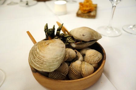 L’apéritif se prend avec le Champagne Dom Ruinart magnum 1998. C’est un champagne confortable qui profite bien du format magnum, qui lui donne une belle ampleur. Agréable et consensuel, ce champagne gagnerait à être un peu plus canaille.