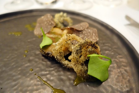 Le Château Olivier Grand Cru Classé de Graves blanc 1953 ne correspond à aucun repère. Il n’est pas madérisé, il serait plutôt fumé comme une infusion. Ses saveurs sont charmantes déroutantes et avec la belle mâche de l’ormeau, l’accord se trouve merveilleusement bien. On est sur des infusions végétales et vineuses, sans acidité sensible. J’adore cet accord et la truffe n’apporte pas grand-chose au vin. C’est la douceur ferme de l’ormeau qui le fait briller.