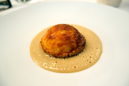 La tourte de langoustine est originale, avec une sauce faite avec les carapaces pilées, un peu comme une sauce Nantua légère. Deux vins l’accompagnent. Le Pavillon Blanc de Château Margaux 1979 est d’un équilibre extrême. Nul ne pourrait lui donner d’âge. Sa couleur est d’un jaune citron mâtiné de jaune d’or, le nez est franc et direct et le goût est d’une grande plénitude, joliment citronné mais aussi blés d’or. Il est joyeux, et si l’on devait lui faire un reproche, c’est qu’il est trop « bon élève », celui qui récite bien ses leçons. On en ferait volontiers son ordinaire mais à côté de lui l’Hermitage Jean-Louis Chave blanc 1986 est majestueux. Les trompettes de la renommée devraient chanter sa gloire car il est d’un accomplissement total. Il a la puissance, la longueur, l’équilibre et la complexité d’un grand vin. Il y ajoute une vibration extrême. Il emplit la bouche d’un liquide qui virevolte. Il y a la fluidité d’un cours d’eau de montagne, des allusions végétales, des vibrations de litchi. C’est surtout la sauce qui crée avec l’Hermitage un accord fusionnel majeur. Je suis conquis.