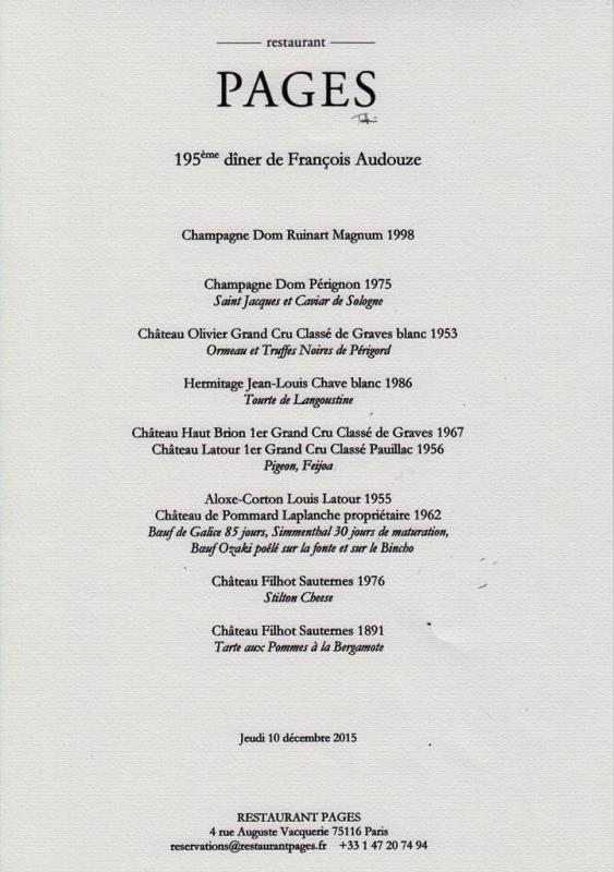 le vin entre le château Olivier et l’Hermitage n’a pas été inclus et n’était pas au programme. Il a été remplace par le Pavillon Blanc de Château Margaux 1979 non présent sur la photo de groupe.