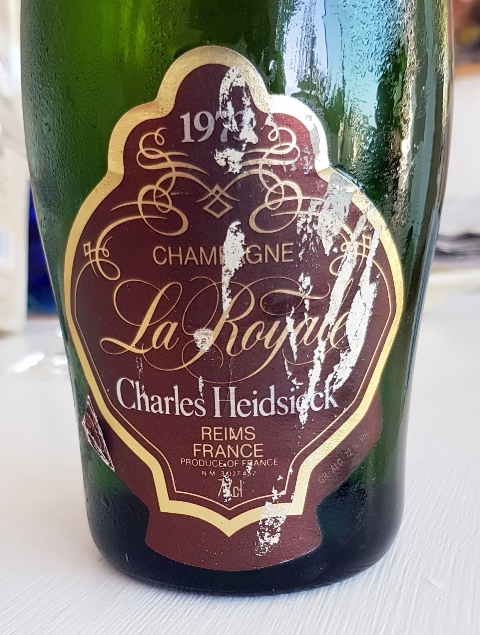 Une amie vient nous rendre visite dans le sud. Elle a apporté divers cadeaux dont une anchoïade et une tapenade. L’appel au champagne est évident pour l’apéritif. Je choisis un Champagne La Royale Charles Heidsieck 1973. Il était très prévisible que le bouchon se brise lorsque l’on veut le tourner, la lunule du bas se désolidarisant. C’est le cas. Je prends mon tirebouchon pour extraire ce disque de quelques millimètres d’épaisseur, et c’est la première fois, je crois, que je ne relève qu’un disque beaucoup plus petit, d’un diamètre inférieur, ce qui laisse comme une auréole qui continue de coller au goulot. Cette auréole est levée avec la mèche longue qui me sert à la suite du tirebouchon.