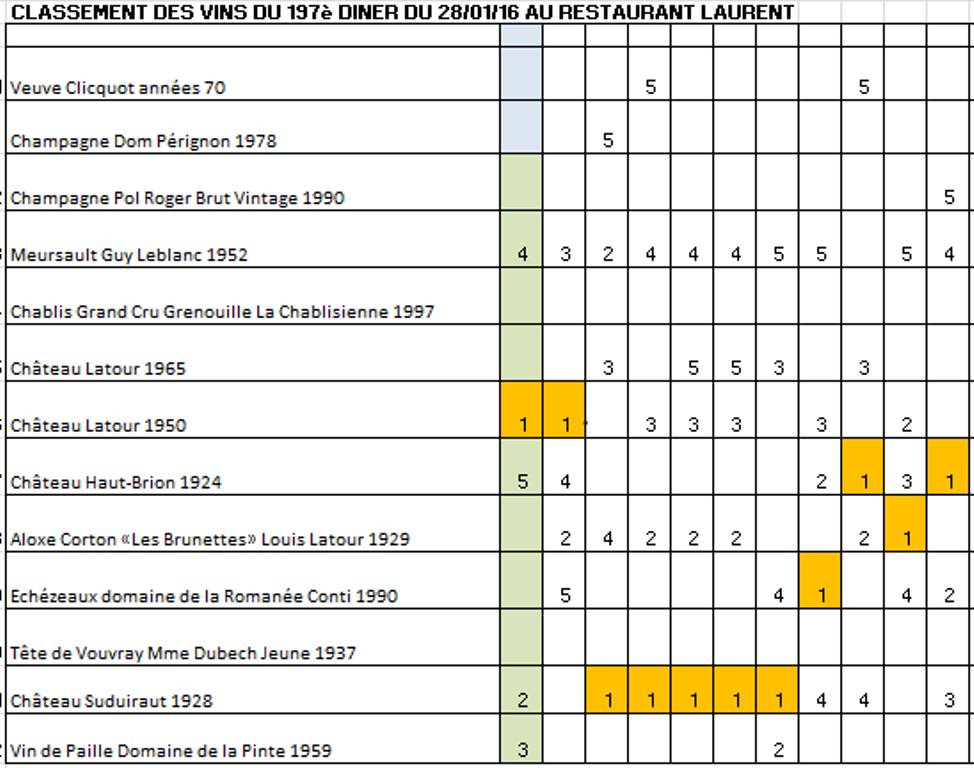 Le vote du consensus serait : 1 – Château Suduiraut 1928, 2 – Aloxe Corton «Les Brunettes» Louis Latour 1929, 3 – Château Latour 1950, 4 – Meursault Guy Leblanc 1952, 5 – Château Haut-Brion 1924.