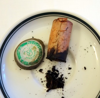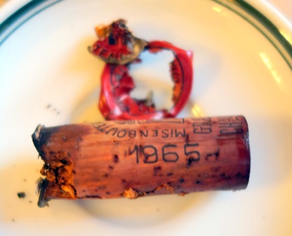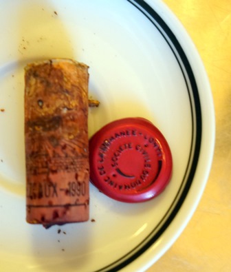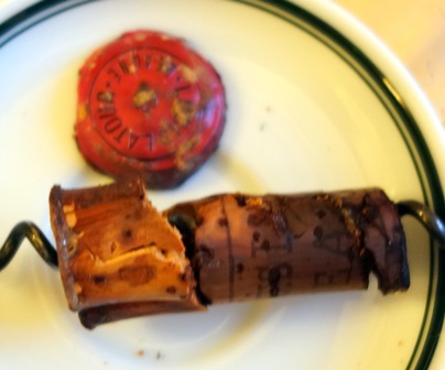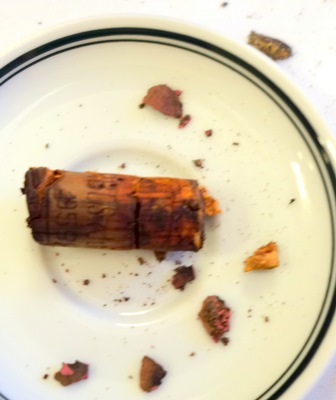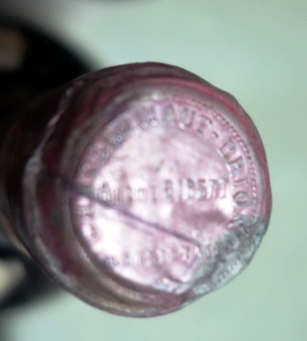 Je me présente au restaurant vers 16h30 pour ouvrir les vins. Daniel, le fidèle sommelier m’apporte les vins qui étaient en cave du restaurant depuis une semaine. Le bouchon du Haut-Brion 1924 colle au verre et le tirebouchon ne retire que des miettes. Il faut s’y reprendre à plusieurs fois pour qu’il sorte et je constate que si le bouchon s’est émietté, c’est parce que le cylindre intérieur du goulot est étranglé en un endroit, interdisant que l’on lève le bouchon sans le déchirer. Il faut dire que la bouteille au cul très profond me semble beaucoup plus ancienne que 1924.
