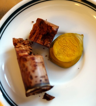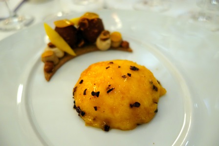Fort curieusement, le Chablis Grand Cru Grenouille La Chablisienne 1997 est presque aussi ambré que le meursault ce qui est anormal et l’on voit bien que le meursault paraît plus jeune que le chablis qui a manifestement une évolution qu’il ne devrait pas avoir. Il n’est pas mauvais mais il n’a en rien les caractéristiques d’un grand cru. Le crémeux d’œuf aux langues d’oursins est un plat merveilleux qui met en valeur les vins blancs et leur convient parfaitement.