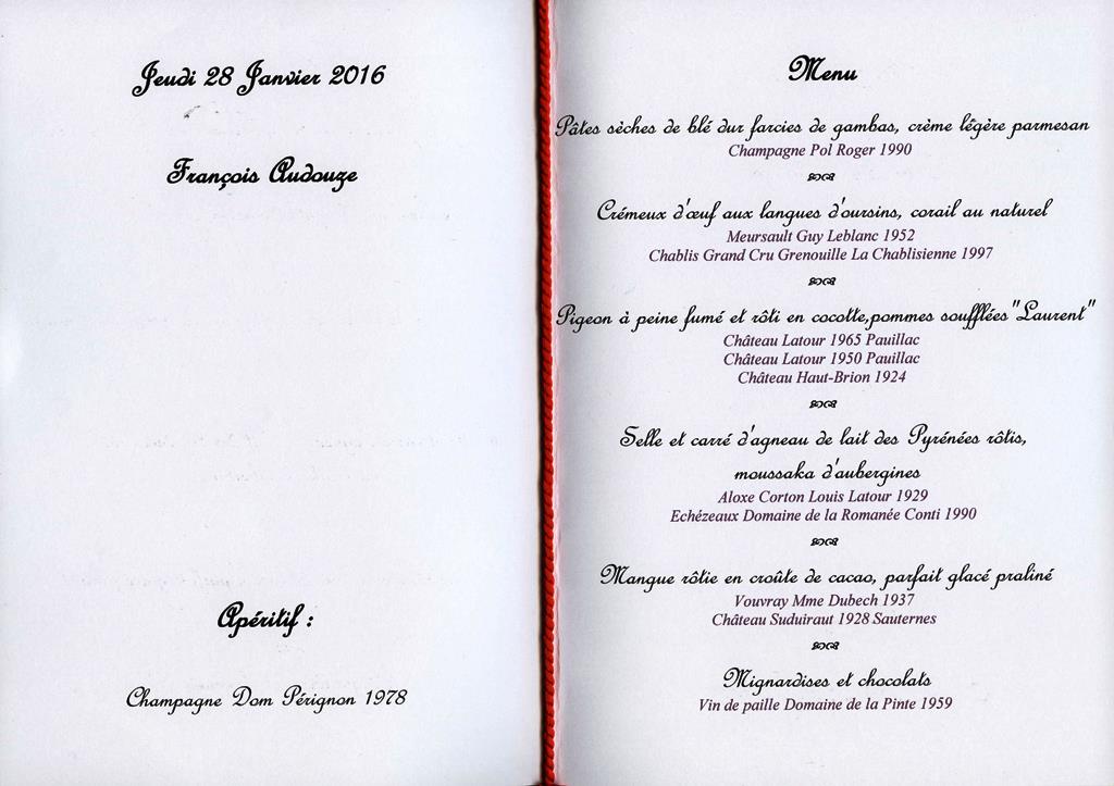 Le menu créé par Alain Pégouret est ainsi composé : pâtes sèches de blé dur farcies de gambas, crème légère au parmesan / crémeux d’œuf aux langues d’oursins, corail au naturel / pigeon à peine fumé et rôti en cocotte, pommes soufflées « Laurent » / selle et carré d’agneau de lait des Pyrénées rôtis, moussaka d’aubergine / mangue rôtie en croûte de cacao, parfait glacé praliné.