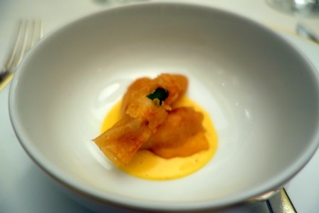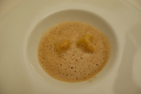 Tant de dîners ont été faits dans ce restaurant qu’on en oublie parfois les consignes. Ainsi, alors que je demande toujours que le vin ne soit servi qu’après le plat, pour que l’un et l’autre se découvrent ensemble, le Bâtard-Montrachet Antonin Rodet 1989 nous est servi longtemps avant les raviolis de foie gras. Le vin a une couleur qui a foncé contrairement au Laville qui est de loin son aîné. Alors, je perçois qu’on prononce un mot que je n’aime pas entendre : « madérisé ». Et lorsqu’enfin on peut boire le vin comme je le souhaite c’est-à-dire avec le plat, les impressions changent car l’émulsion de morilles donne un tel coup de fouet qu’il devient vivace et civilisé. Le vin a effectivement un peu d’oxydation, mais avec le plat adapté, l’accord est superbe. C’est ainsi que le vin trouve sa justification, offrant des notes de caramel et de chocolat en plus de fruits bruns.