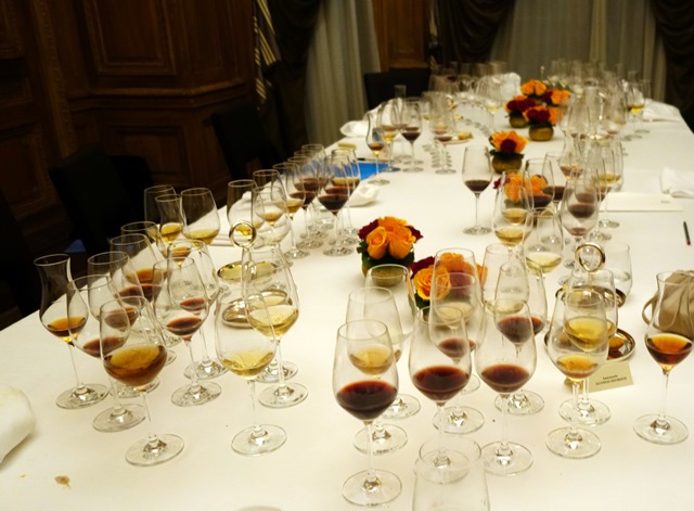 Sur la pastilla de pigeon, nous avons deux bordeaux qui vont jouer une compétition intéressante. Au moment où ils sont servis, le Château Carbonnieux Graves rouge 1952 est rude, truffé, un peu ingrat, alors que le Château Lynch-Bages Pauillac 1950 est élégant, gracieux, parfaitement aérien. Le premier est collé au sol quand l’autre danse. Mais les choses vont changer surtout si l’on fait entrer en jeu les lies des vins. La lie du Carbonnieux est de grande force avec une plénitude que j’apprécie au point que je voterai pour le Carbonnieux et pas pour le Lynch Bages alors que six convives voteront à l’inverse pour le Lynch Bages et pas le Carbonnieux. L’intéressant est surtout qu’ils nous ont offert deux images du vin de Bordeaux, le Pauillac plus féminin et séduisant, avec des notes orientales et le Graves plus solide, réglissé et truffé.