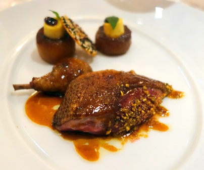 Nous passons à table. Le menu créé par Alain Pégouret : « la carotte » en salade fraîchement râpée, le jus concentré et assaisonné à la pomme épicée / pince de tourteau décortiquée et sa bisque / pigeon à peine fumé et rôti, navets fondants au foie gras relevés au gingembre acidulé, croustilles de légumes / pièce de bœuf poêlée, servie en aiguillettes, pommes soufflées « Laurent », jus aux herbes / Stilton / Merveilleux à la vanille.
