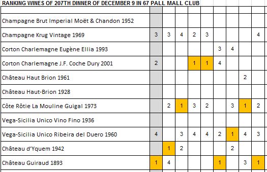 Le vote du consensus, compilation des votes est : 1 – Côte Rôtie La Mouline Guigal 1973, 2 – Vega-Sicilia Unico Ribera del Duero 1960, 3 – Château Guiraud 1893, 4 – Corton Charlemagne J.F. Coche Dury 2001, 5 – Champagne Krug Vintage 1969, 6 – Château d’Yquem 1942.