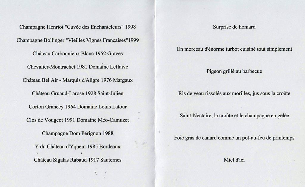 Le menu composé par Guy Savoy, que nous avons mis au point ensemble, est : Surprise de homard / Un morceau d’énorme turbot cuisiné tout simplement / Pigeon grillé au barbecue / Ris de veau rissolé aux morilles, jus sous la croûte / Saint-nectaire, la croûte et le champagne en gelée / Foie gras de canard comme un pot-au-feu de printemps / Miel d’ici et mangues.