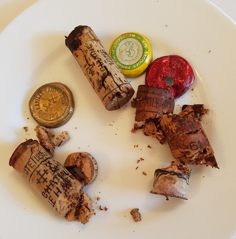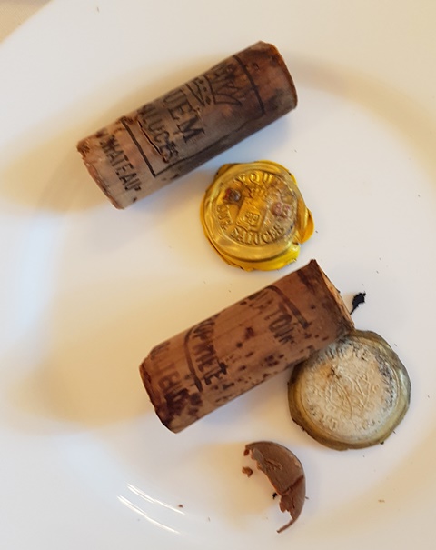 Les vins ont été livrés au restaurant il y a une semaine. Quand j’arrive à 17 heures pour ouvrir les bouteilles, le jeune Benjamin, nouveau dans l’équipe de sommellerie que j’ai déjà croisé pour mes repas au Taillevent, m’assiste et me regarde officier. Je lui fais sentir les vins. Aucun bouchon ne me pose de problème irréversible. Comme cela arrive souvent, le haut du bouchon de la Romanée Conti sent la terre, alors que le bouchon du Rayas sent plutôt le bois du tonneau, sur sa seule partie supérieure. Les parfums les plus beaux sont ceux de la Romanée Conti 1980, du Palmer 1961, de l’Yquem 1983 et de Laville Haut-Brion 1948. Celui de La Tour Blanche 1948 est le plus réservé.