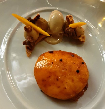 Le Montrachet Jacques Prieur 1986 est un vin de belle puissance mais contenue. C’est un vin riche mais calme. Il est très équilibré, à maturité, avec un beau fruit fécond, mais il joue un jeu un peu trop calme. Aussi, alors qu’au début du plat, il devançait largement le vin de Bordeaux, il s’est fait dépasser dans nos cœurs par le Laville miraculé. Les deux vins se comportent bien sur le plat que je considère comme le plus réussi et abouti du repas.