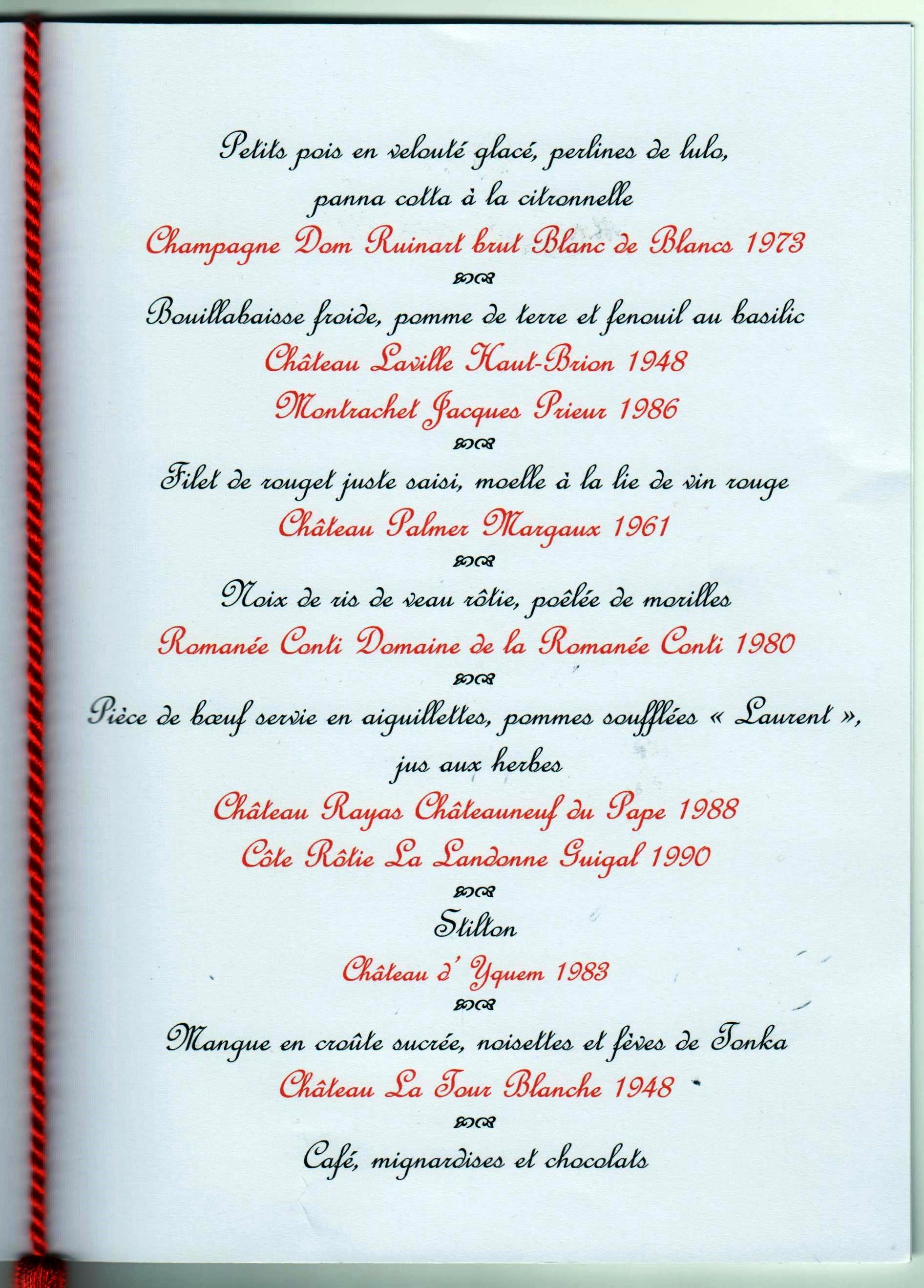 Le menu créé par Alain Pégouret est : Petits pois en velouté glacé, perlines de lulo, panna cotta à la citronnelle / Bouillabaisse froide, pomme de terre et fenouil au basilic / Filet de rouget juste saisi, moelle à la lie de vin rouge / Noix de ris de veau rôtie, poêlée de morilles / Pièce de bœuf servie en aiguillettes, pommes soufflées « Laurent », jus aux herbes / Stilton / Mangue en croûte sucrée, noisettes et fèves de Tonka.
