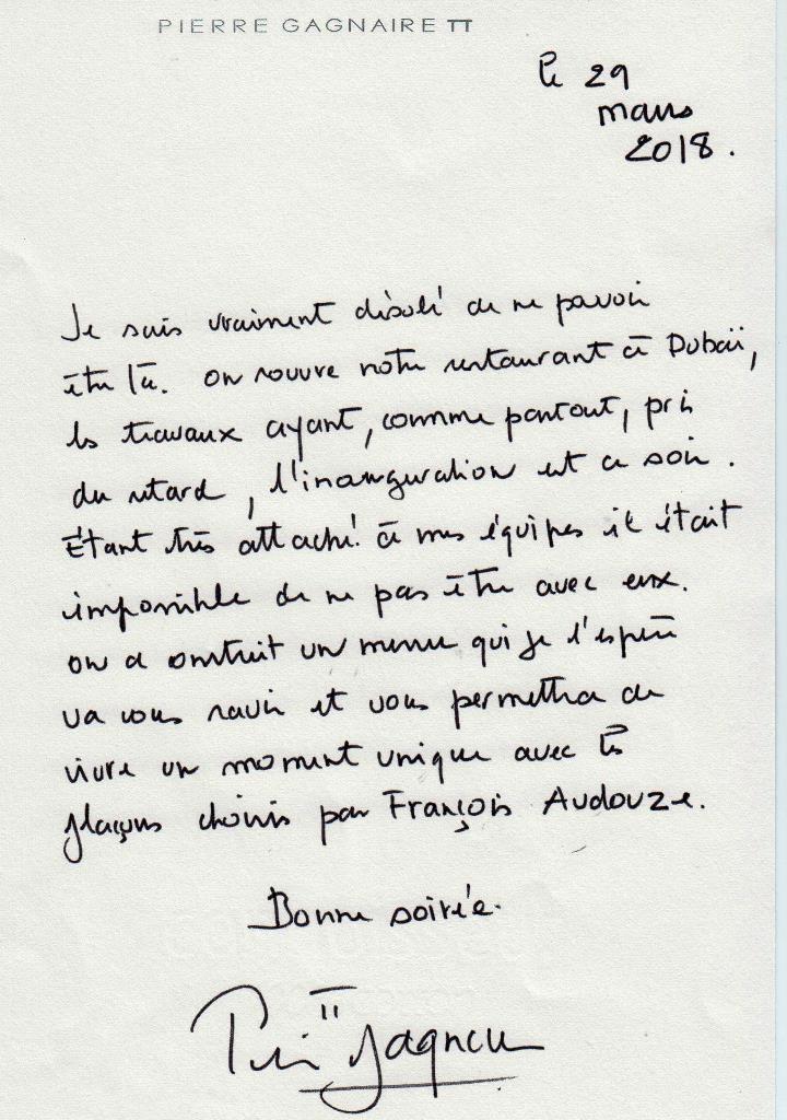 Avec le menu Pierre Gagnaire a fait remettre à chacun une lettre manuscrite dans laquelle il s’excuse de ne pas être auprès de nous. Cette attention est très appréciée.
