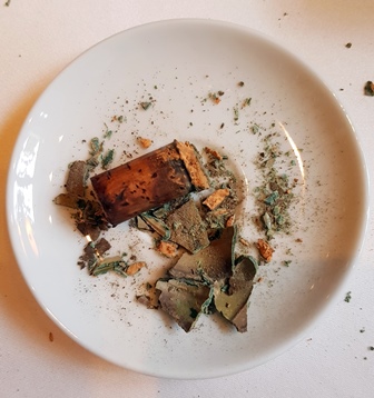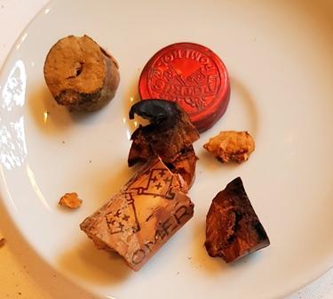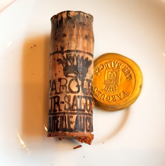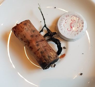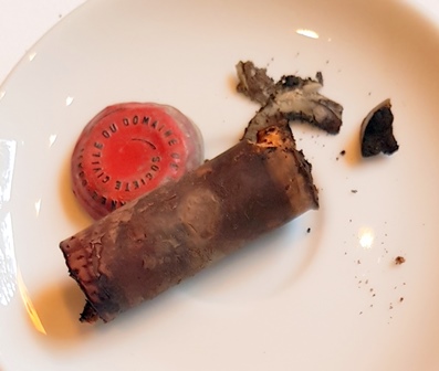 Le 222ème dîner se tient au restaurant Pierre Gagnaire. J’avais fait le 91ème dîner en son restaurant parisien et j’ai eu envie de recommencer. La mise au point du menu s’est faite en deux temps, d’abord avec Pierre Gagnaire, puis, sous son autorité avec les chefs Thierry Méchinaud et Michel Nave. Les vins avaient été apportés il y a plus d’une semaine. A 16h30 commence la séance d’ouverture des vins. Je suis rejoint par Logan sommelier qui fera le service des vins et je lui fais sentir, ainsi qu’à quelques membres de l’équipe du restaurant, les parfums des vins. Ce qui est assez invraisemblable c’est que ce sont les vins les plus vieux qui ont les parfums les plus généreux. Dans l’ordre d’âge, le Chypre 1870 a un parfum lourd qui évoque des madères et un poivre insistant. Le Musigny 1906 a un parfum marqué d’un beau fruit, le Lafite 1908 qui a été reconditionné au château en 1990 a un fruit insolent et fort curieusement un bouchon qui se casse en deux, l’Yquem 1921 a des fragrances exceptionnelles, à se damner. La seule mauvaise surprise est celle de La Tâche 1961 dont le bouchon, seulement à moitié levé, exprime une odeur de serpillère insistante. Le bouchon vient entier, noir et gras et le vin sent la lavasse. J’ai bien peur pour lui et c’est le seul. Le bouchon du Musigny 1906 a été sorti en charpie, émietté comme rarement.
