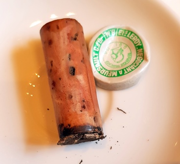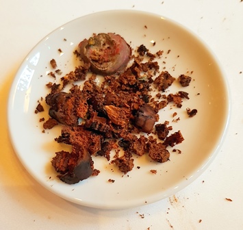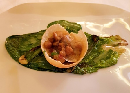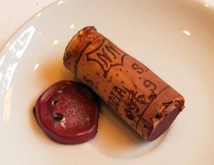 Le quasi de veau est probablement le plat le plus charmeur et goûteux de ce magnifique repas. Le Grand Musigny Faiveley 1906 est un grand vin, doté d’un beau fruit et d’un très joli équilibre. Alors que pour mon goût il est très au-dessus de La Tâche Domaine de la Romanée Conti 1961, c’est paradoxalement La Tâche qui recevra largement plus de votes que le Faiveley. Est-ce la fascination de tout ce qui vient de la Romanée Conti ? Car au moment du service il n’y a plus aucune trace de serpillère ou de lavasse, mais le nez est clairement bouchonné. Or, comme cela arrive assez souvent, le nez de bouchon ne se ressent pas en bouche. Le vin a de la rondeur et une belle expressivité. Mais même s’il n’y a pas l’amertume rêche que donne un goût de bouchon, je ne peux pas aimer le 1961 plus que le 1906. Le plat est divin et aide bien le Musigny.